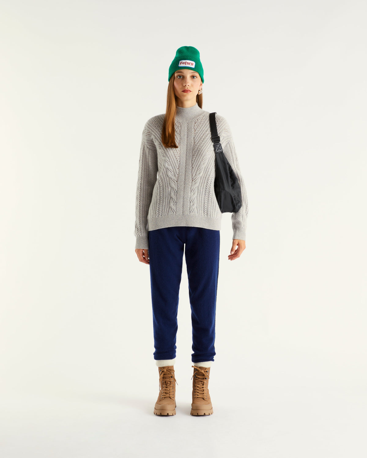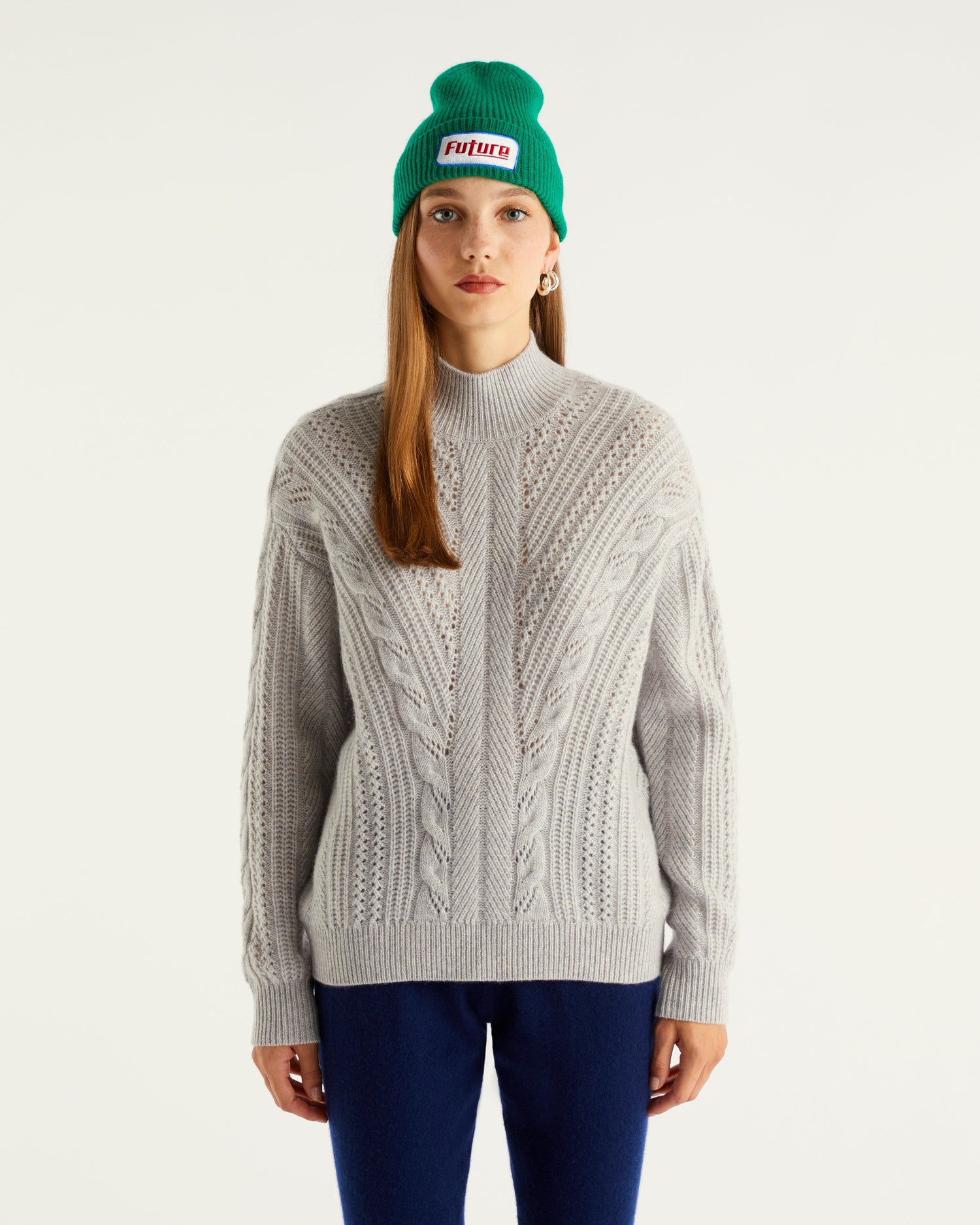 Pull Col Montant Court Oversize Torsades 6 Fils - 100% Cachemire - Gris Chiné Clair