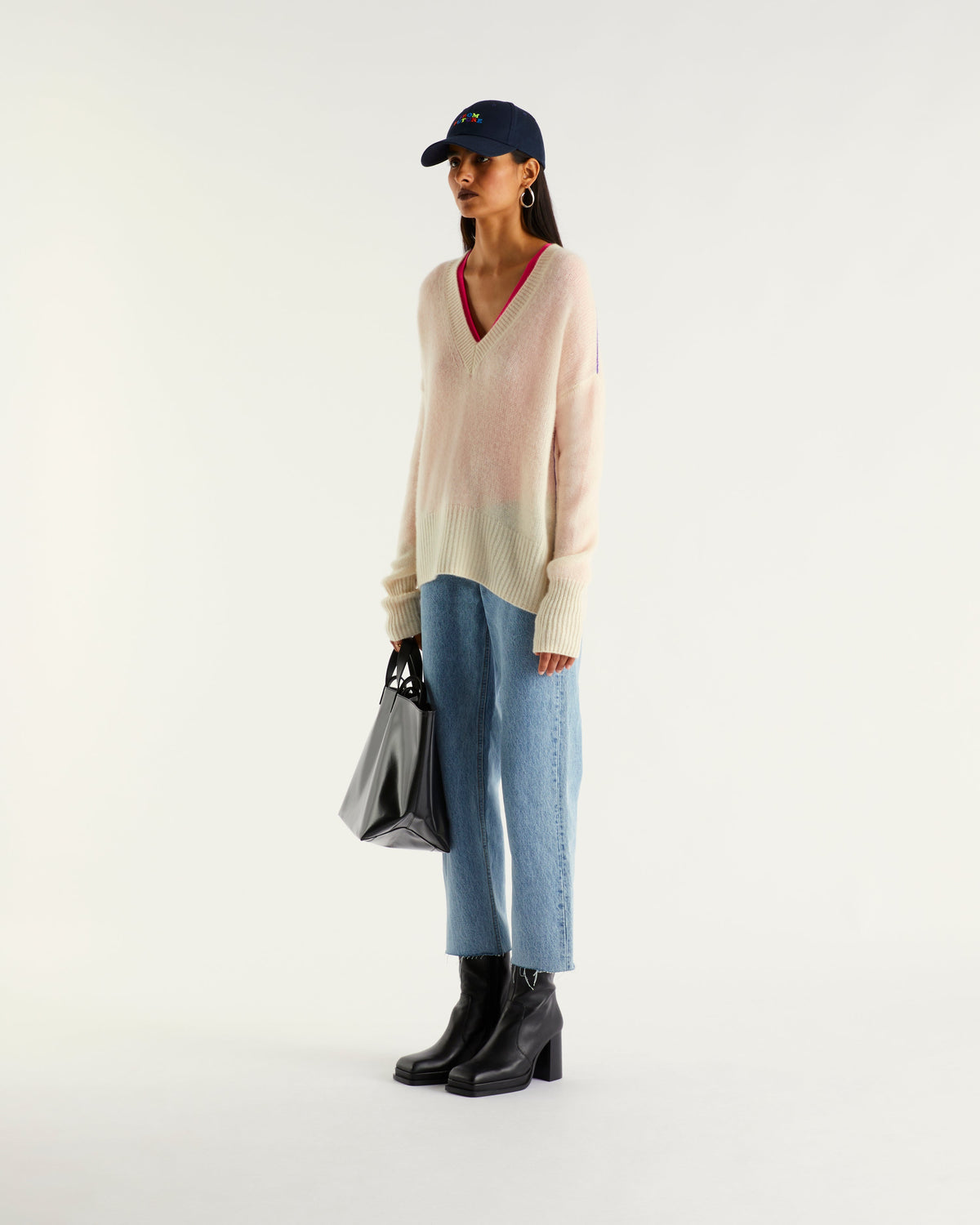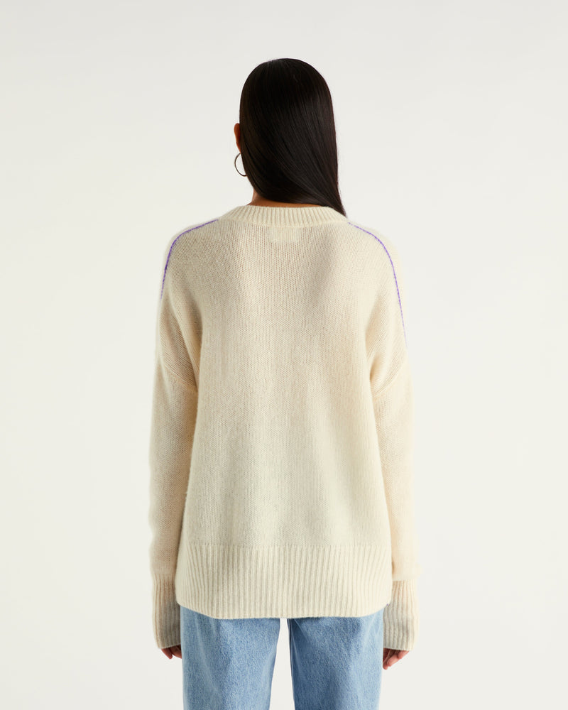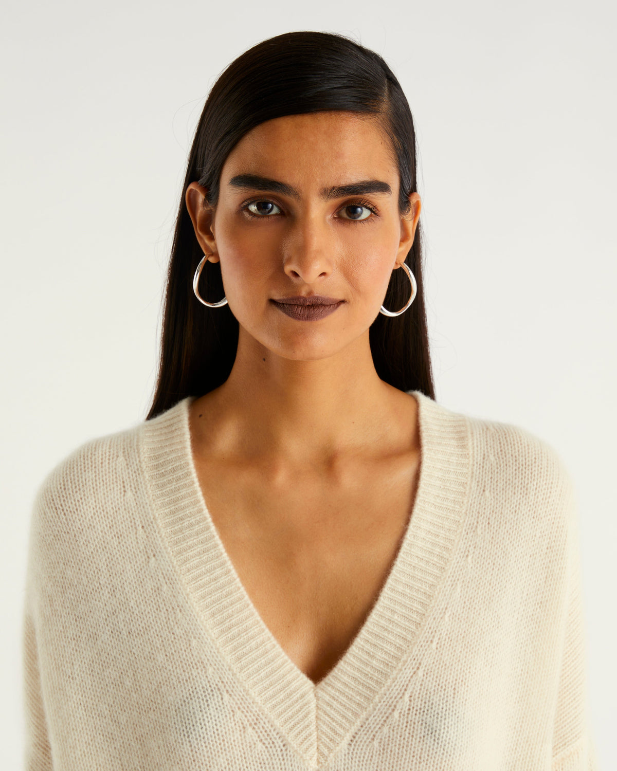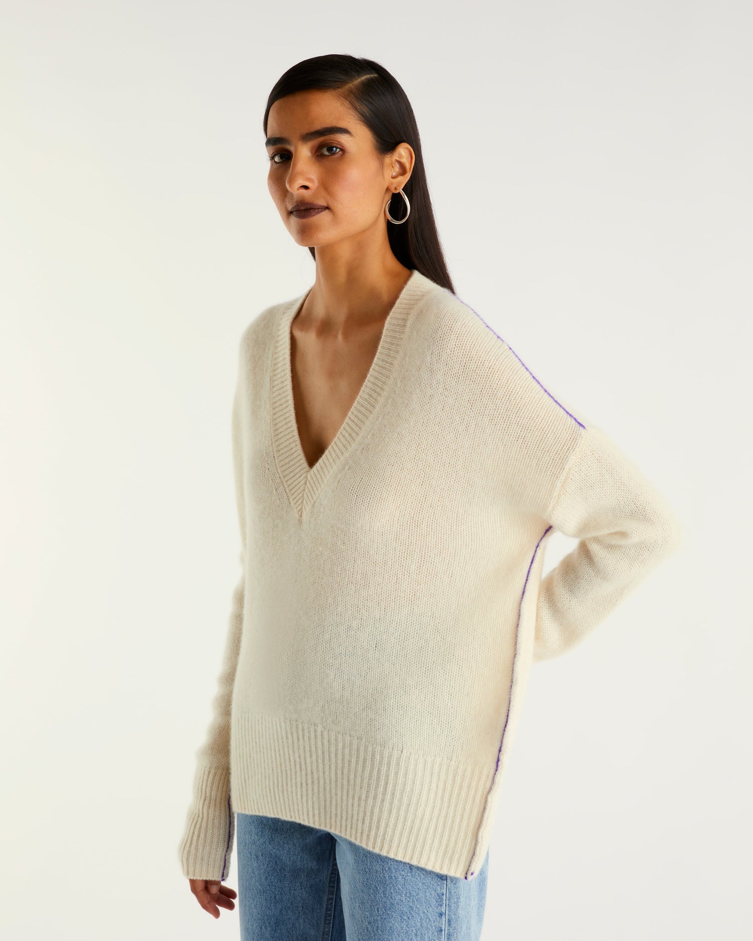 Pull Col V Court Oversize Linking Contrastés 6 Fils - 100% Cachemire - Écru