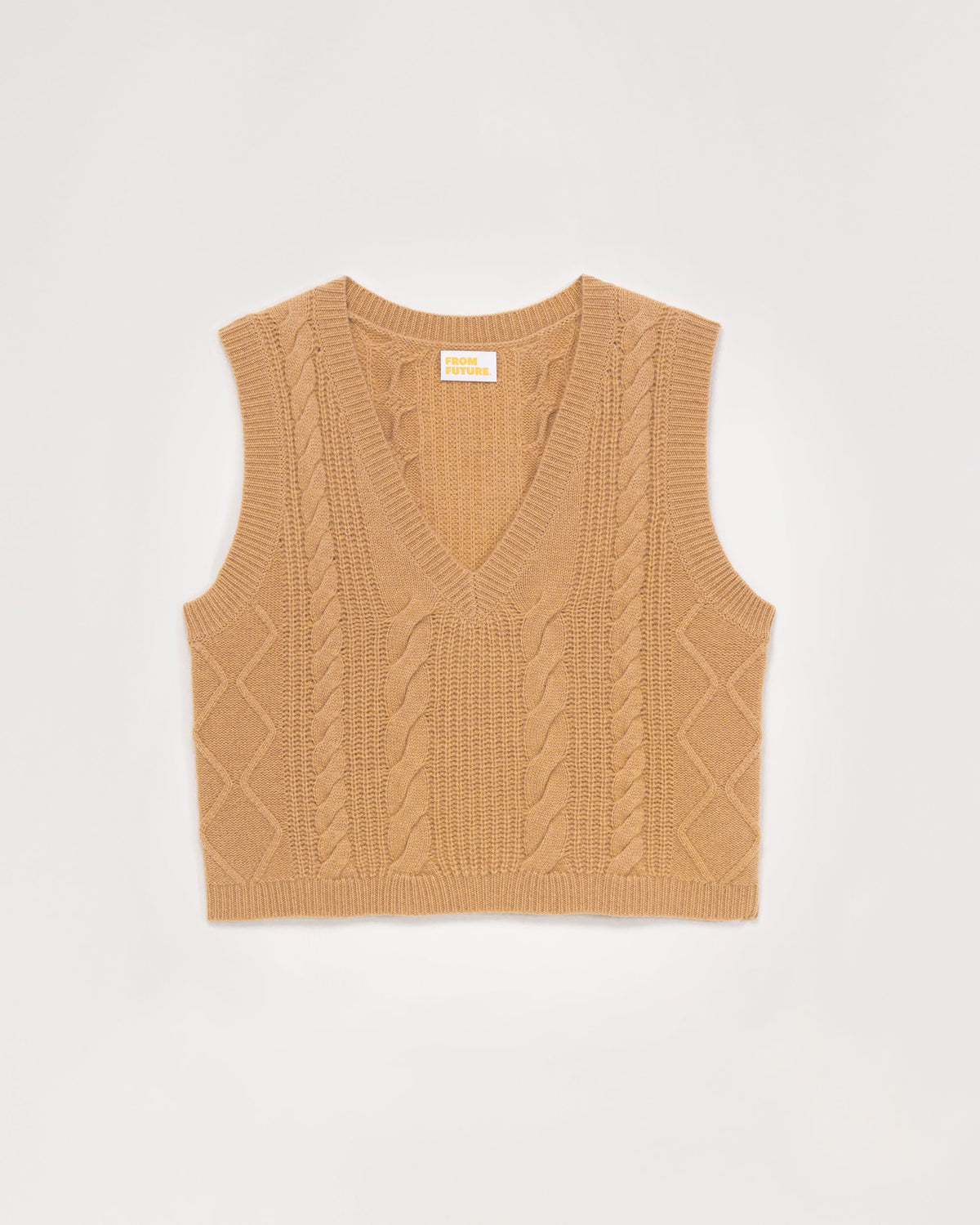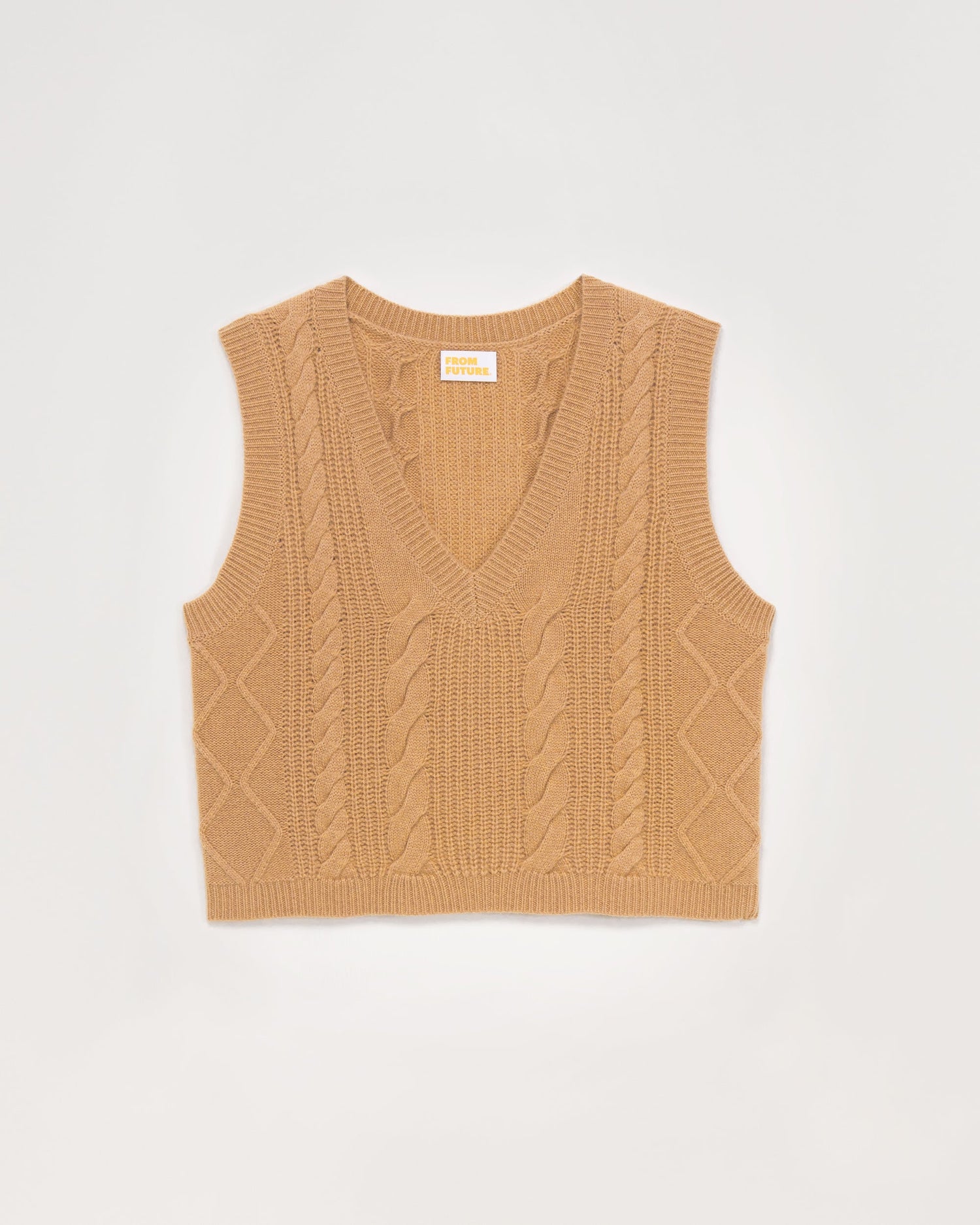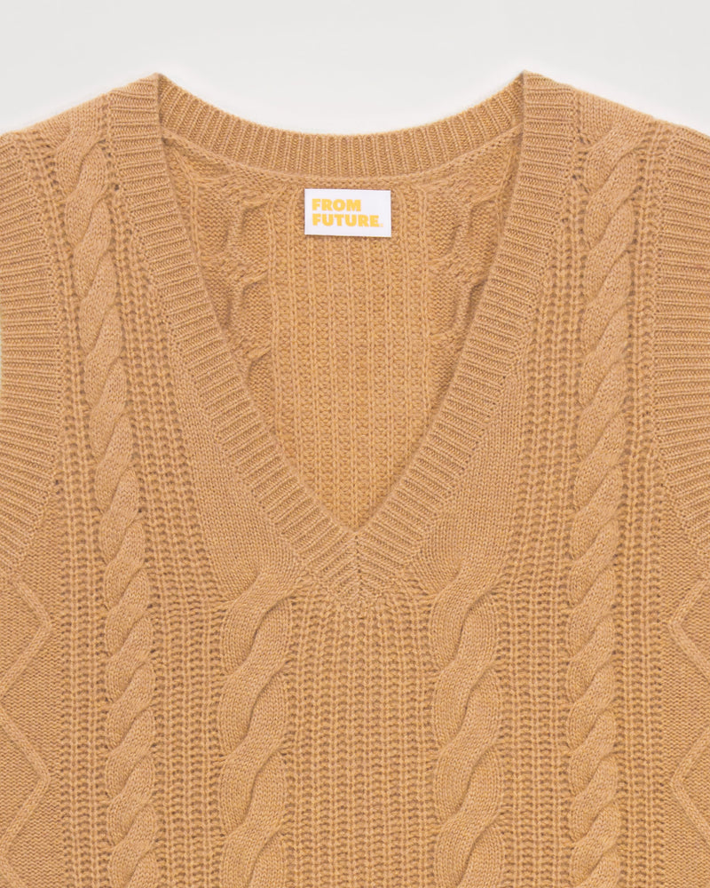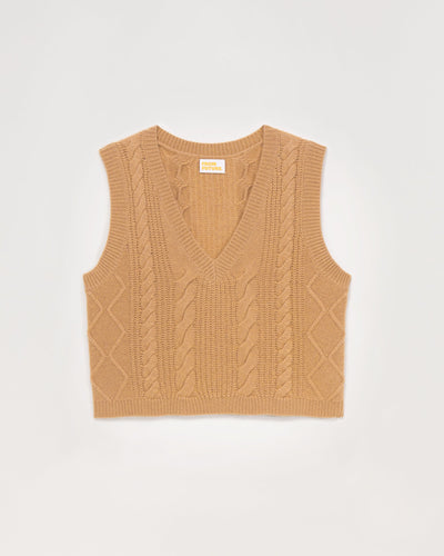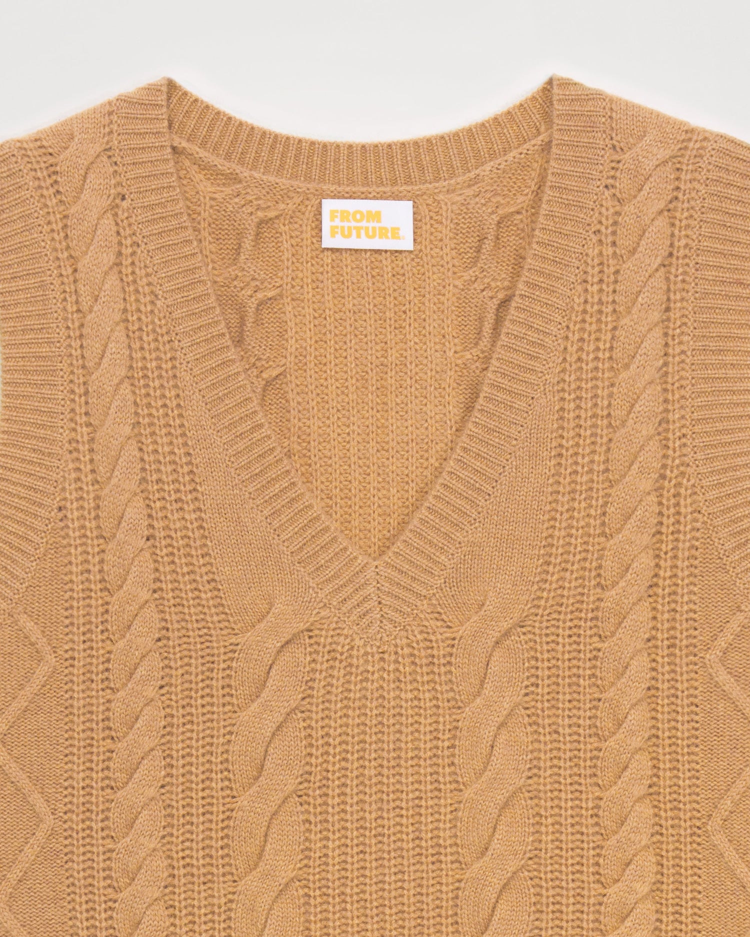 Pull Col V Court Sans Manche À Torsades 6 Fils - 100% Cachemire - Camel