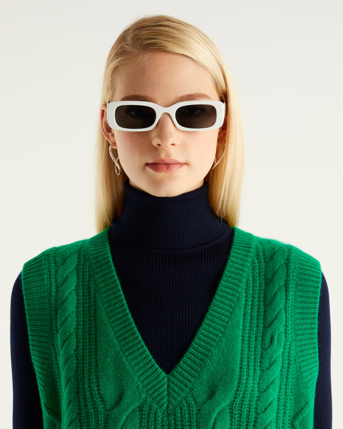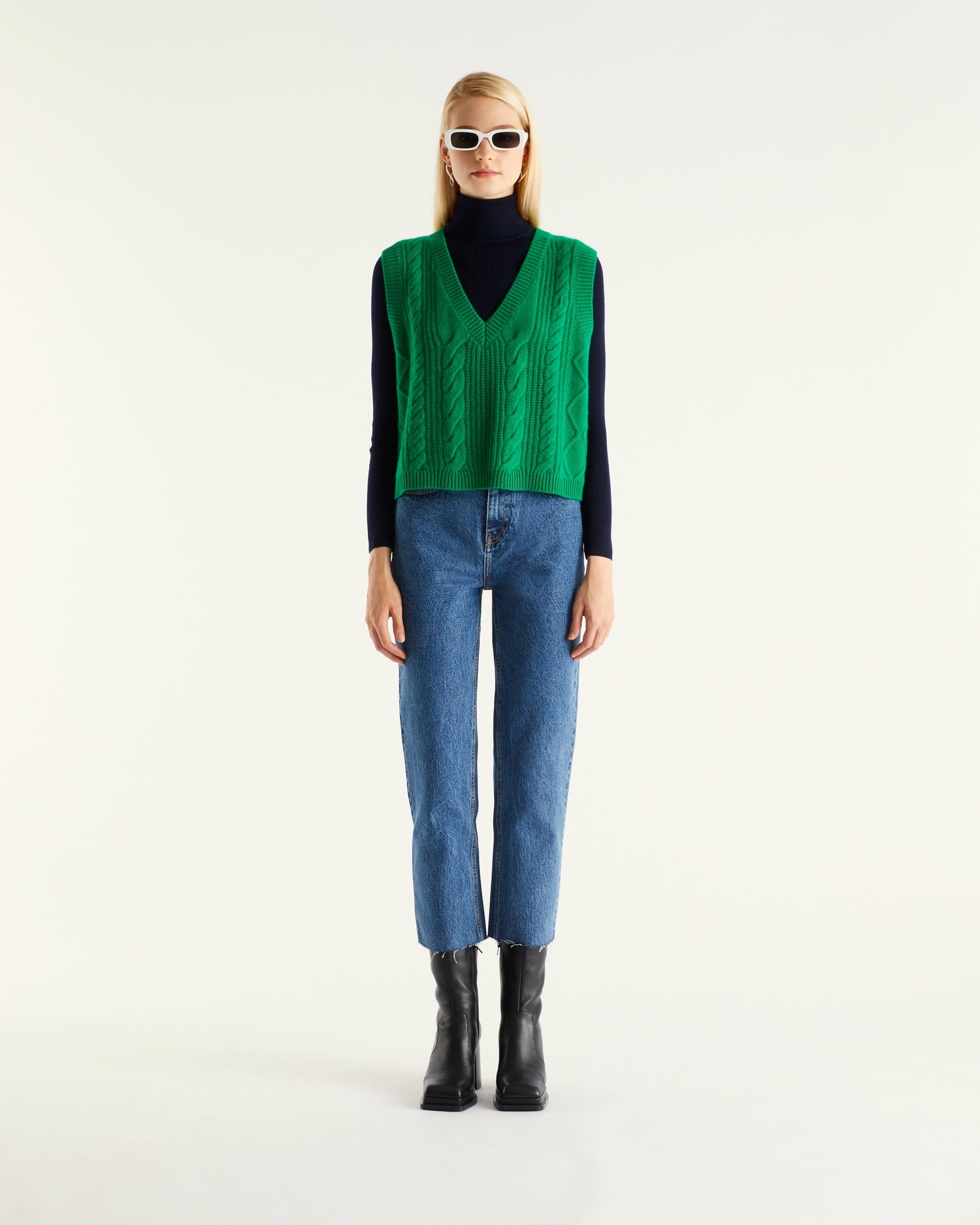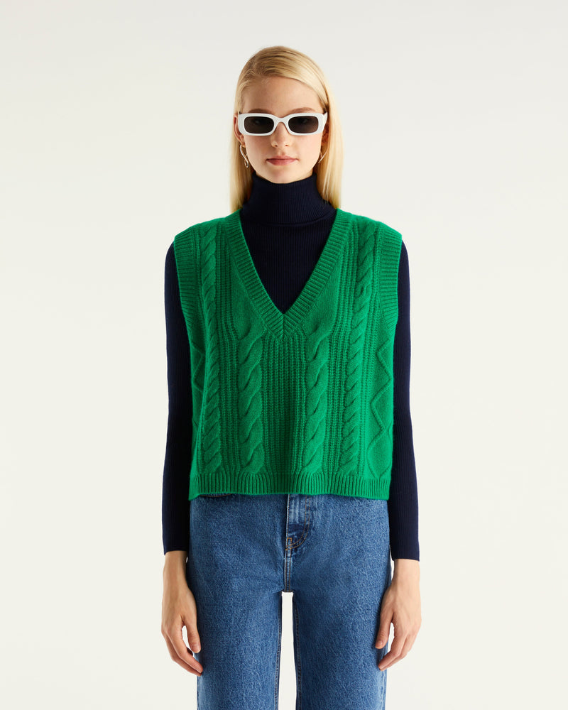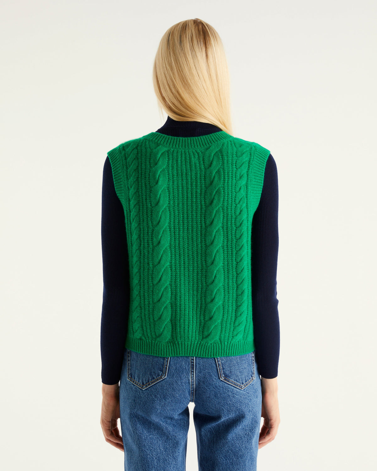 Pull Col V Court Sans Manche À Torsades 6 Fils - 100% Cachemire - Vert gazon