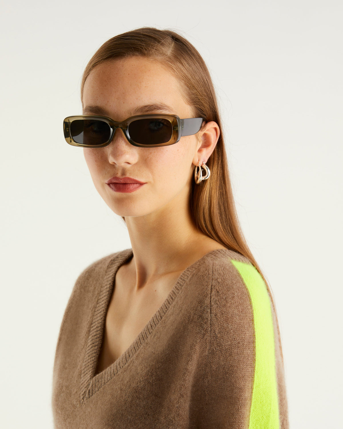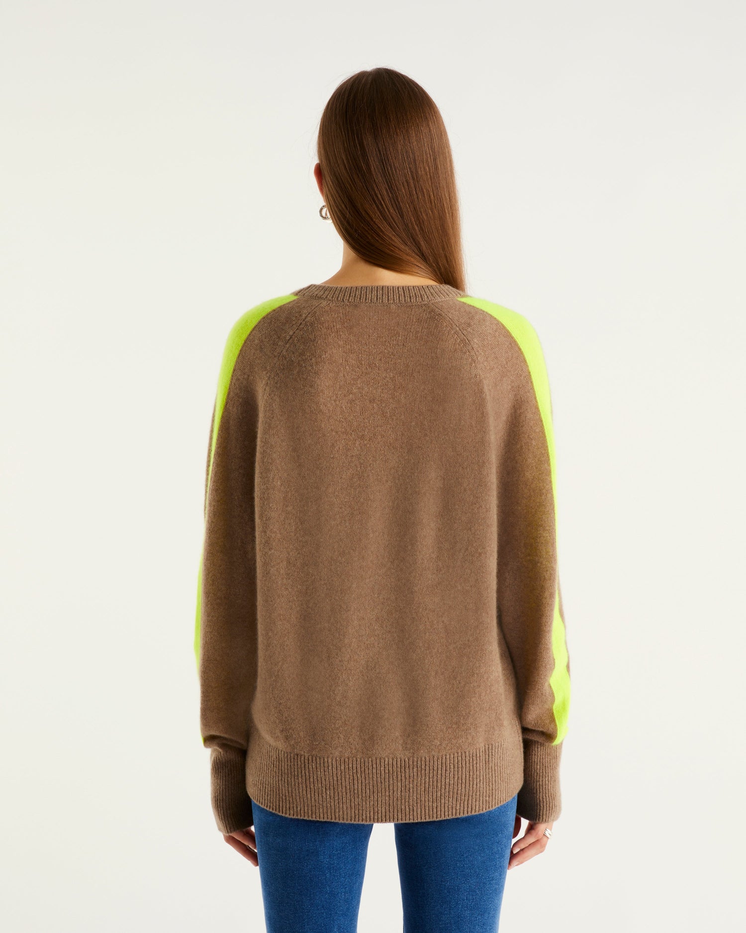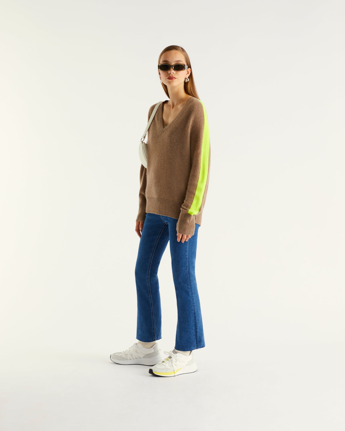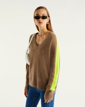 Pull Col V Oversize Bande Manche 2 Fils - 100% Cachemire - Taupe