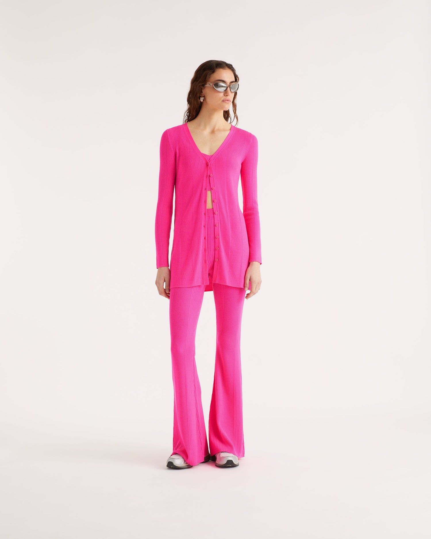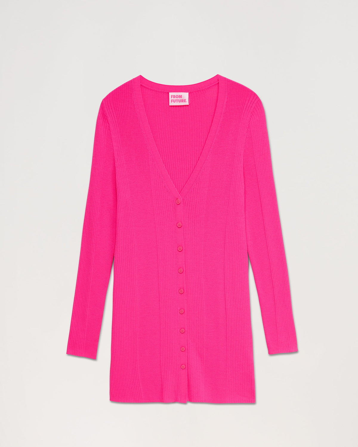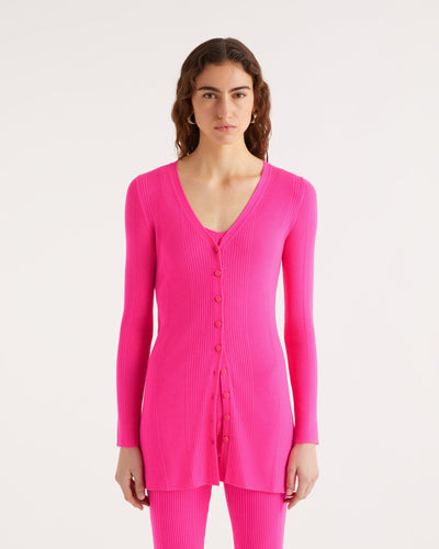 Pull Cardigan Long Uni A Cotes - Laine Mérinos - Summer fuschia