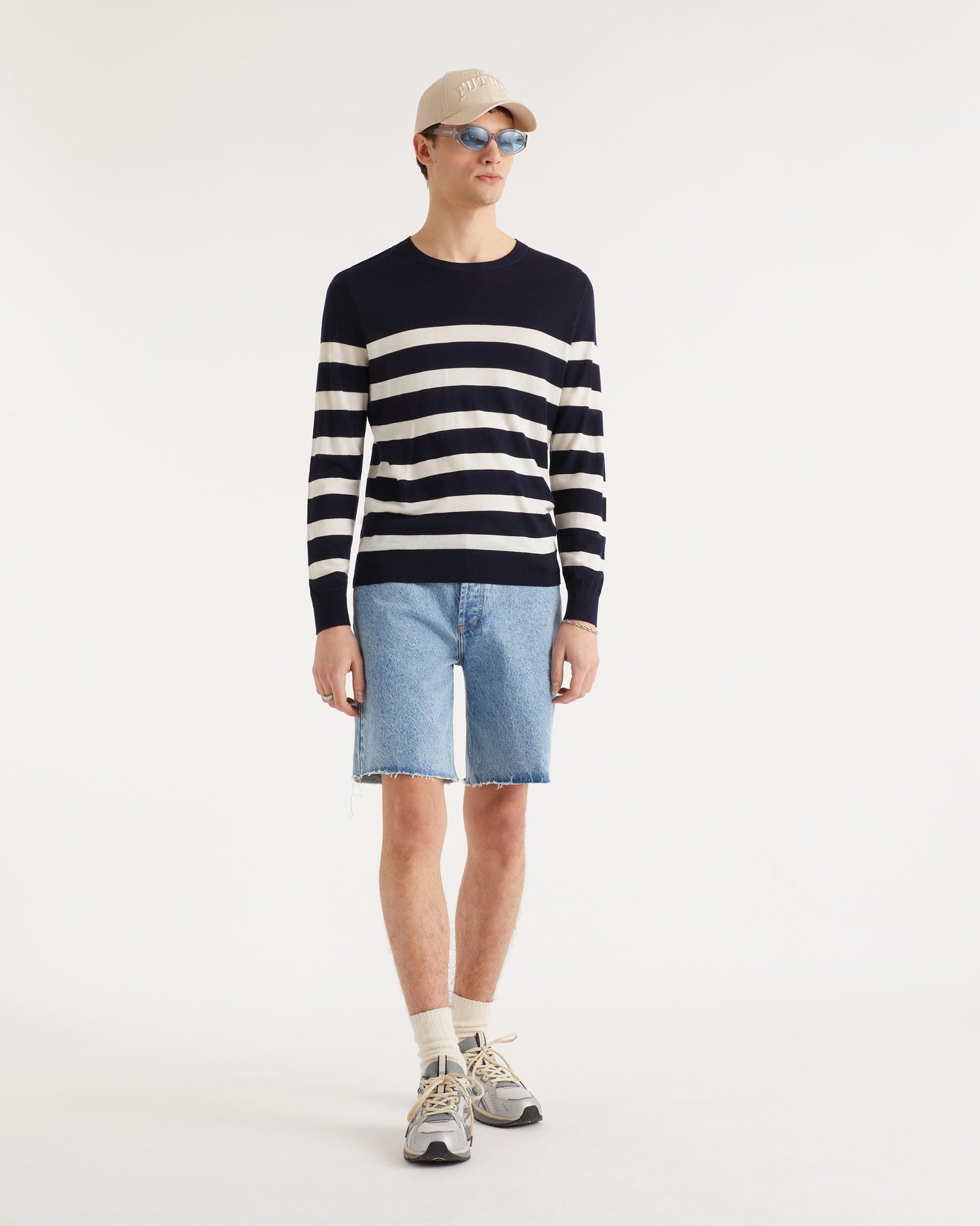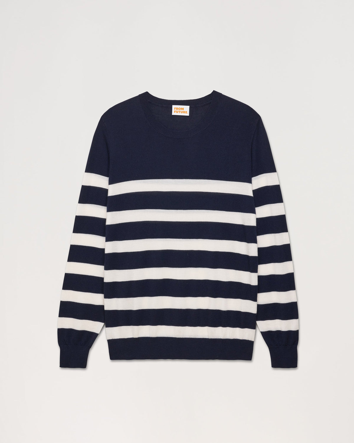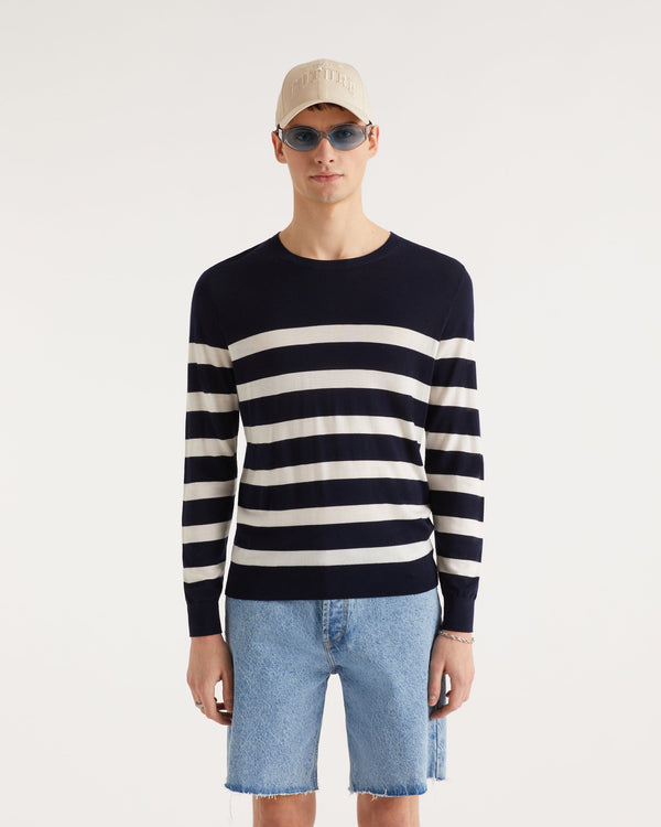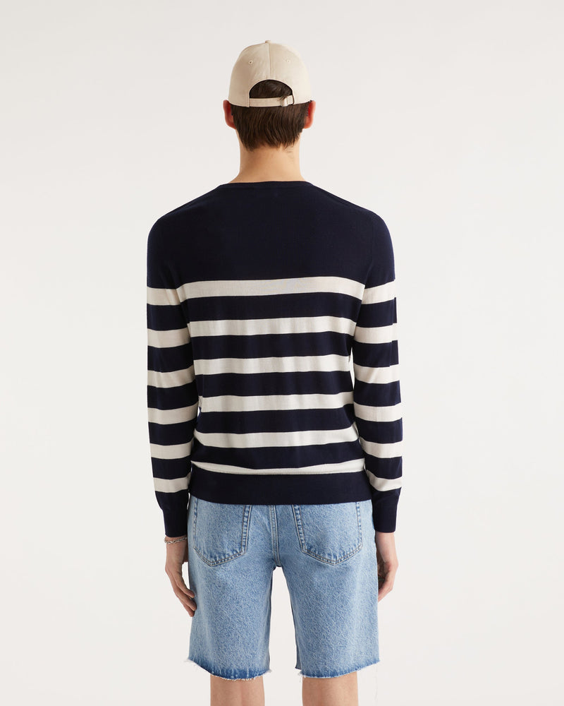 Pull Pull Col Rond à Rayures - Laine Mérinos - Navy