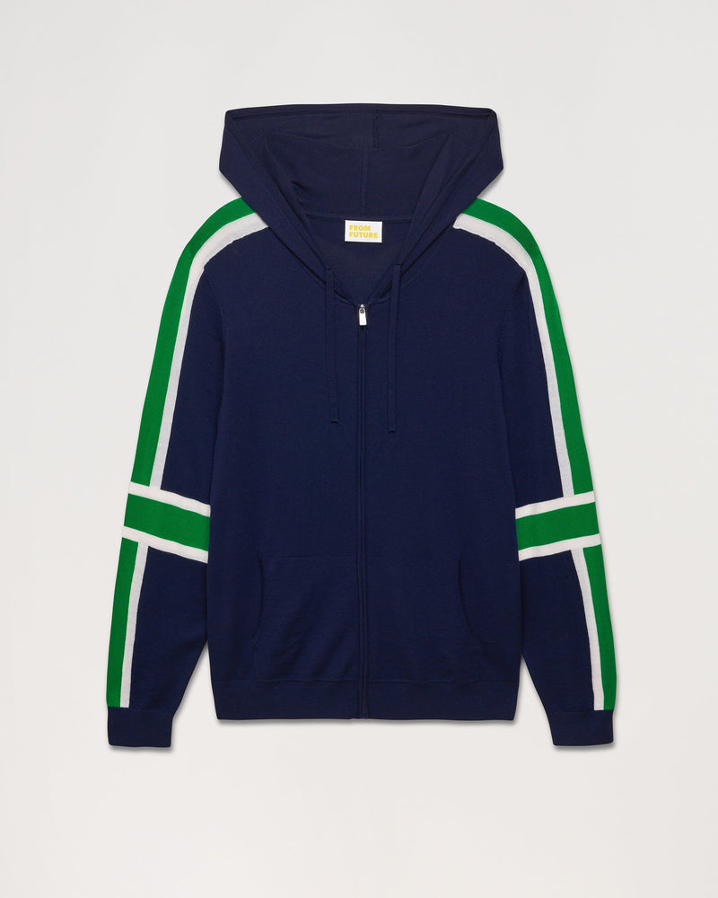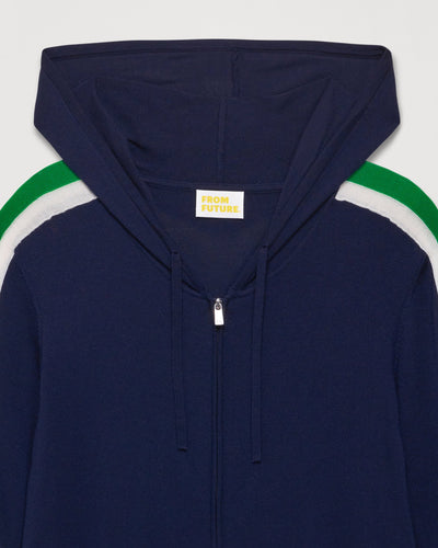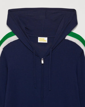 Pull Hoodie Zippe A Bande Manches Brassard - Laine Mérinos - Navy