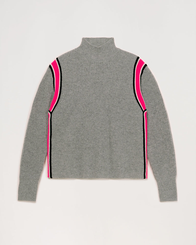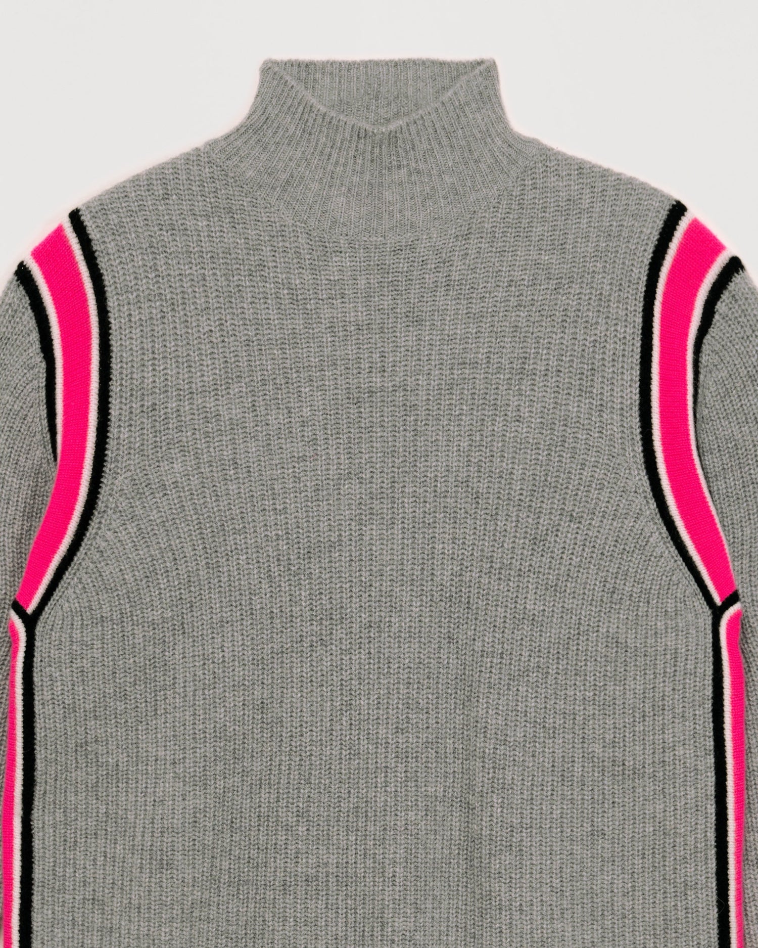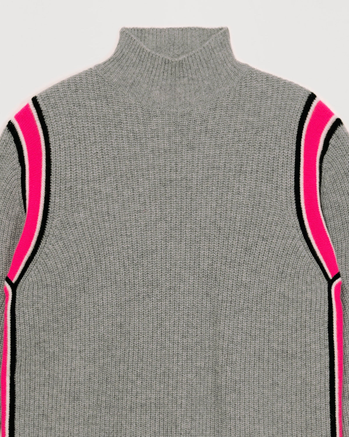 Pull Col Montant Court Maille Perlée Bande 4 Fils - 100% Cachemire - Gris chine fonc