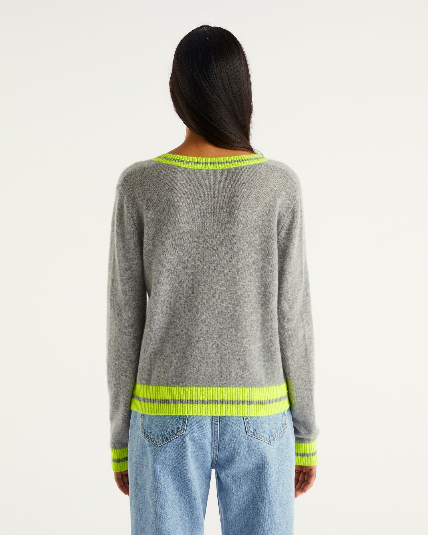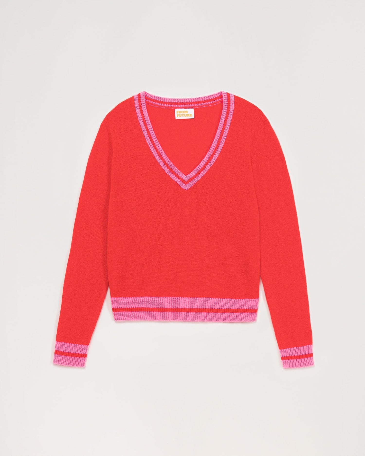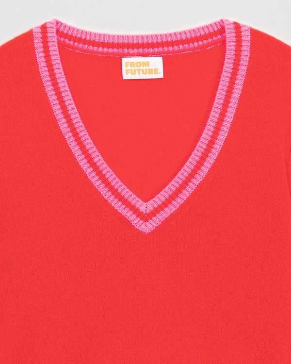 Pull Col V Court Rayure Tennis 2 Fils - 100% Cachemire - Rouge vif