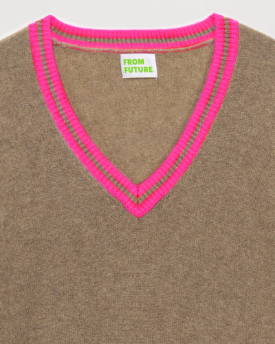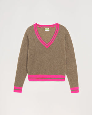 Pull Col V Court Rayure Tennis 2 Fils - 100% Cachemire - Taupe