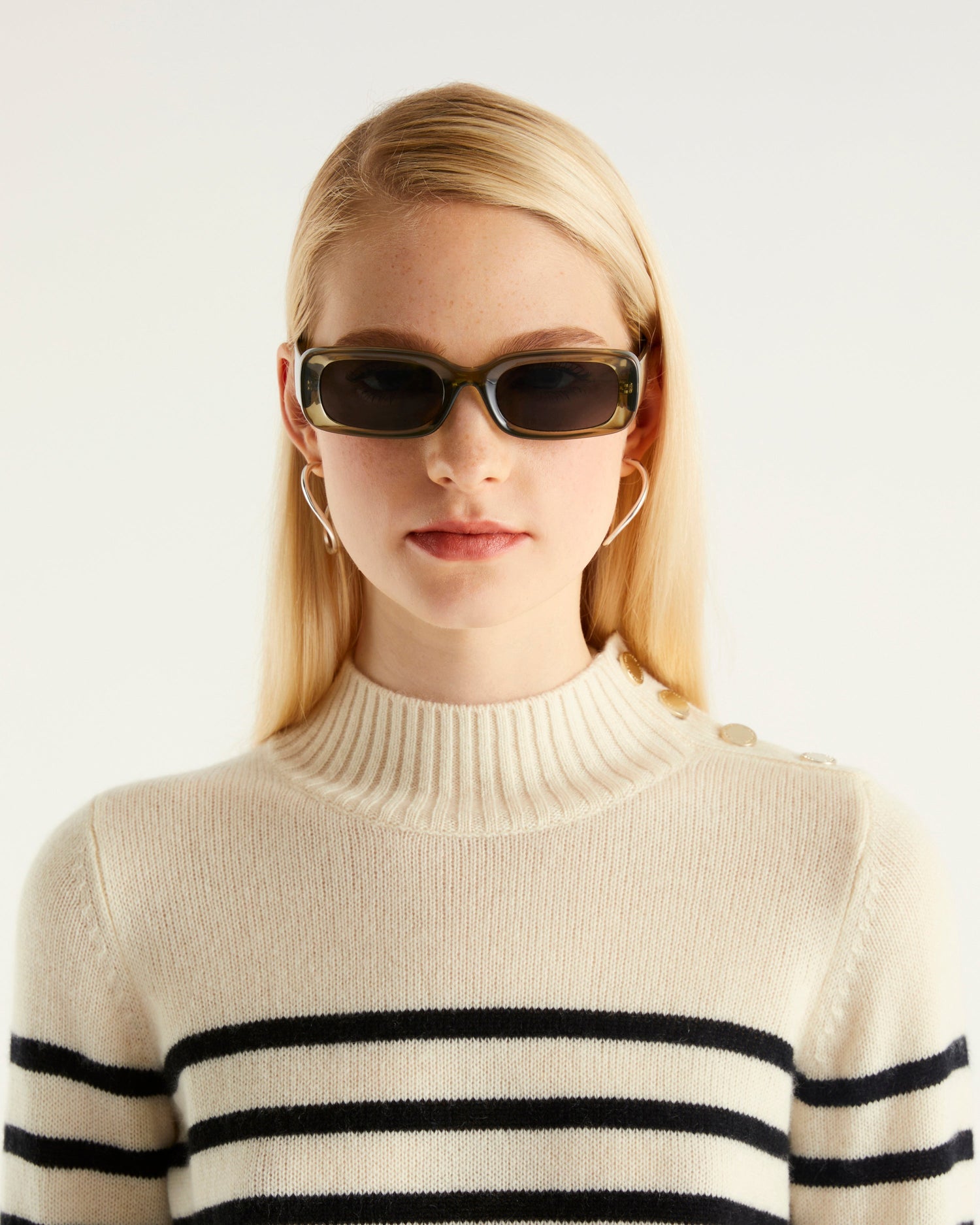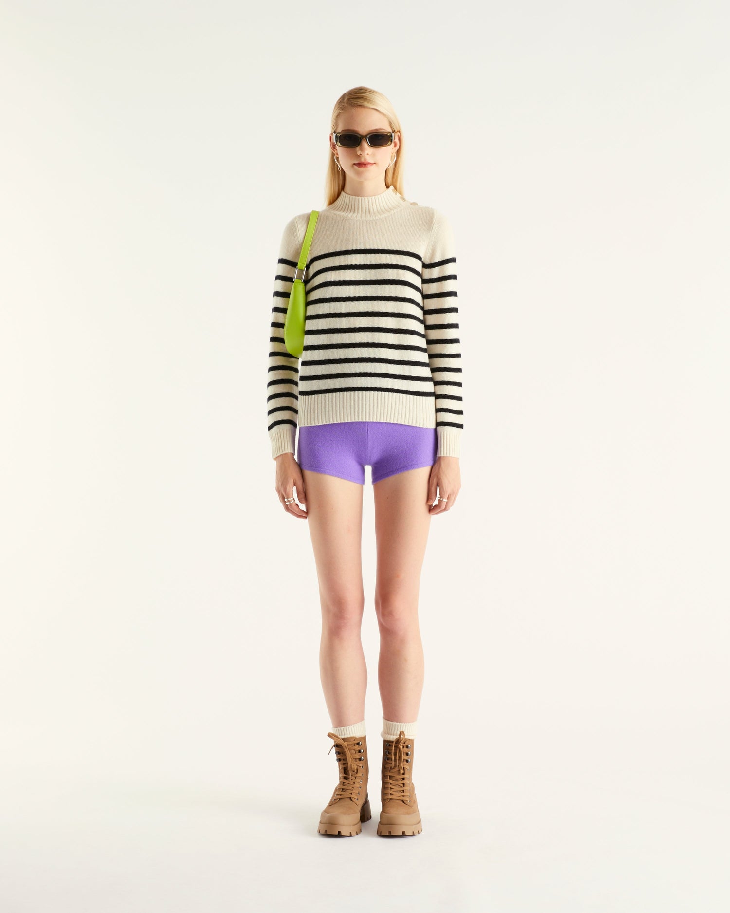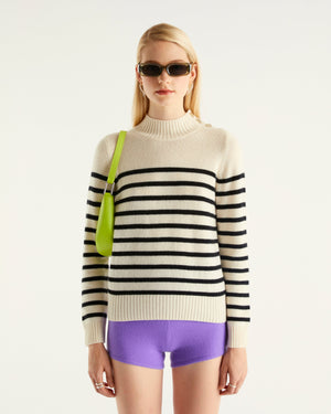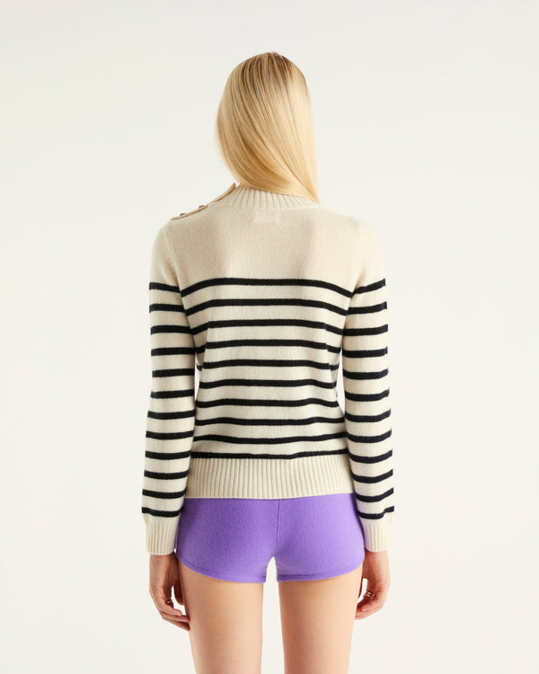 Pull Marinière Col Montant À Bouton 4 Fils - 100% Cachemire - Ecru