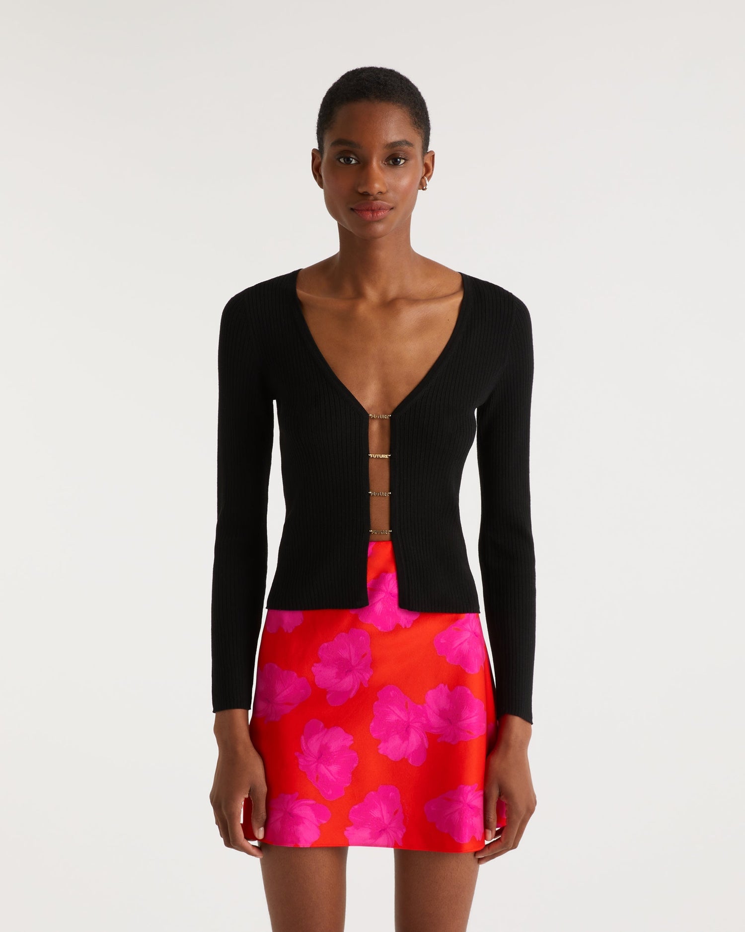 Pull Cardigan à Côtes Bijoux Future Dores - Laine Mérinos - Noir